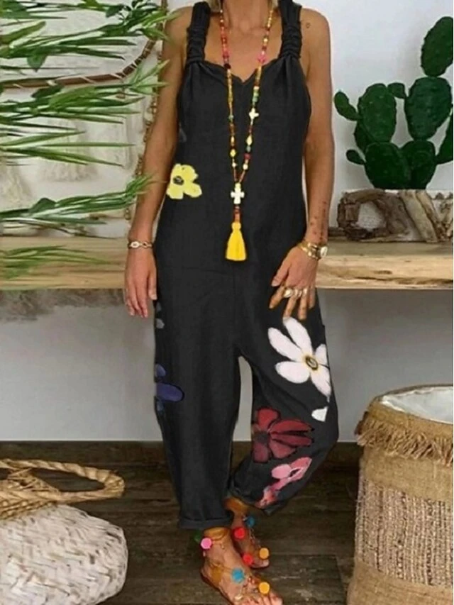 Jumpsuits For Women Summer Backless Floral U Neck Active Casual Daily Straight Regular Fit Sleeveless Blue Black Gray S M L Spring