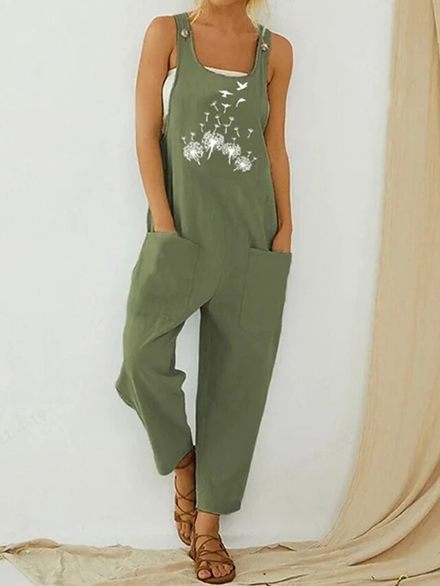 Jumpsuits For Women Summer Overall Bib Utility Patch Pocket Print Floral U Neck Streetwear Street Daily Regular Fit Sleeveless Army Green Blue S M L