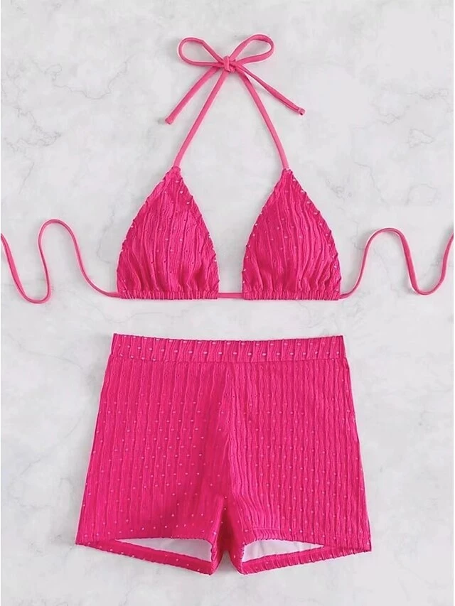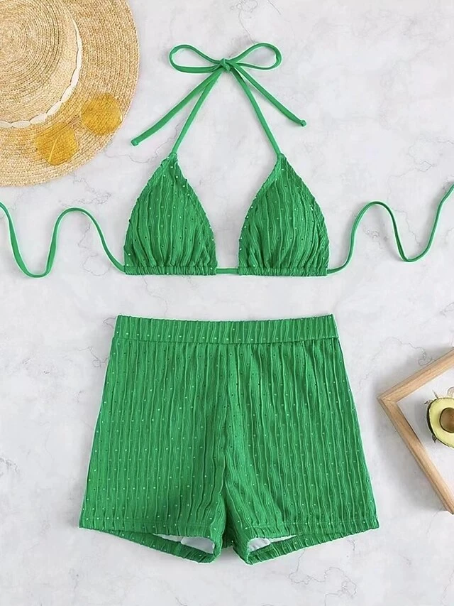 NEW Textured Bikinis Women Vintage High Waisted Shorts Halter Neck Bikini Soft Pads Two Piece Swimwear Solid Colors Ladies String Swimsuits Adjustable Beachwear