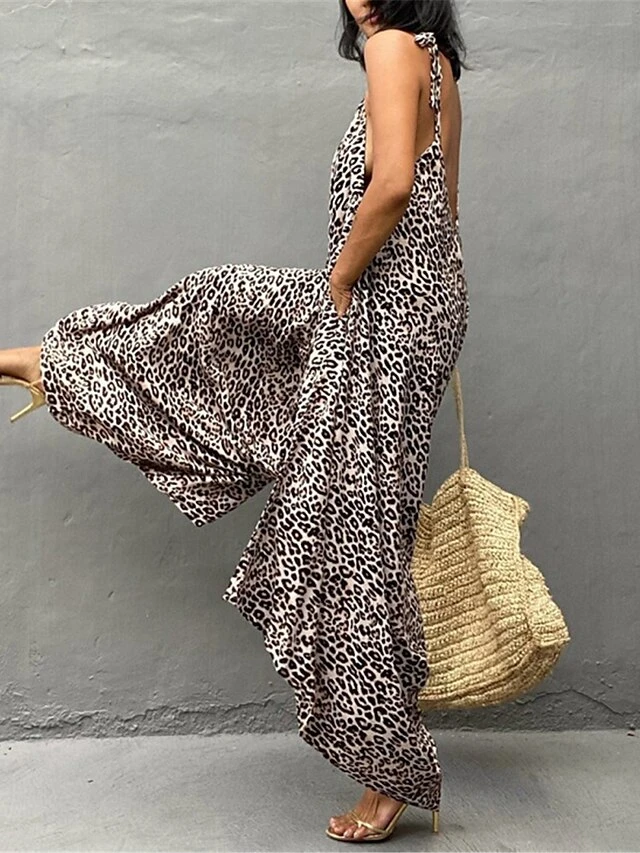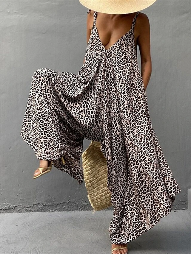 One Piece Jumpsuits For Women Pocket Print Leopard V Neck Streetwear Street Daily Regular Fit Sleeveless Black Blue Khaki S M L Summer