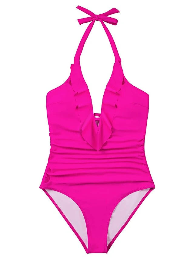 Sexy Deep V-Neck Swimwear For Women Backless Halter Neck One Piece Swimsuit Ruffle Plunge Padded Bathing Suits Cute Beach Wear Solid Colors