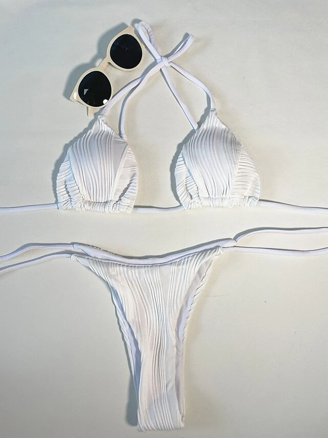 Sexy String Bikini 2023 Women Solid Colors Thong Halter Bikinis Set Textured Swimsuit Adjustable Micro Bathing Suit Feminino Biquini Set Beachwear Swimming Suit