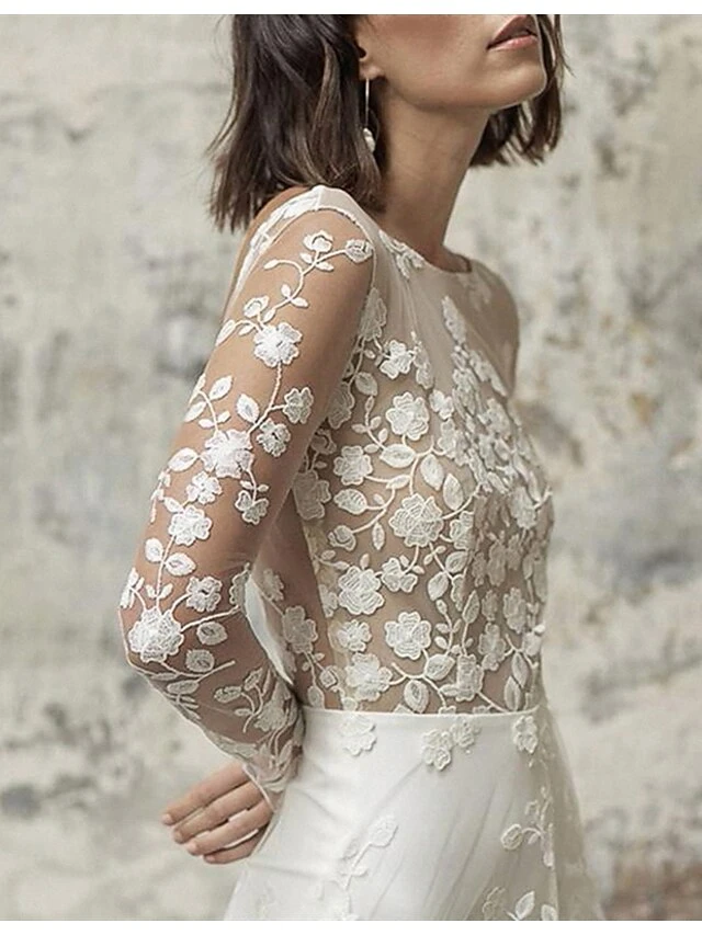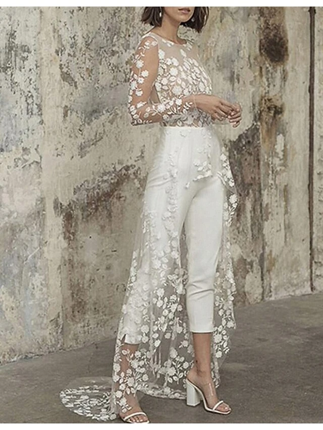 White Jumpsuit For Women Backless Overlay Lace Solid Color Crew Neck Elegant Party Wedding Regular Fit Long Sleeve S M L Spring
