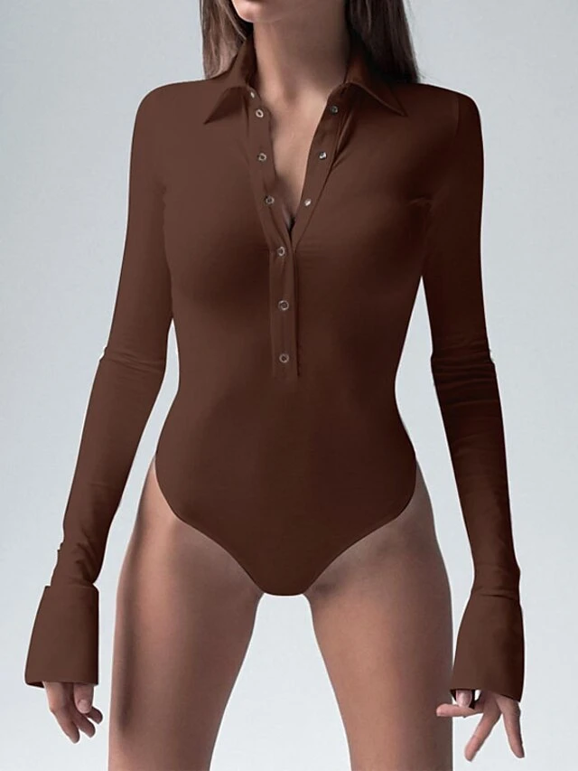 Women’s Bodysuit Button Solid Color Shirt Collar Streetwear Home Street Regular Fit Long Sleeve Black Brown White S M L Spring Cold Weather