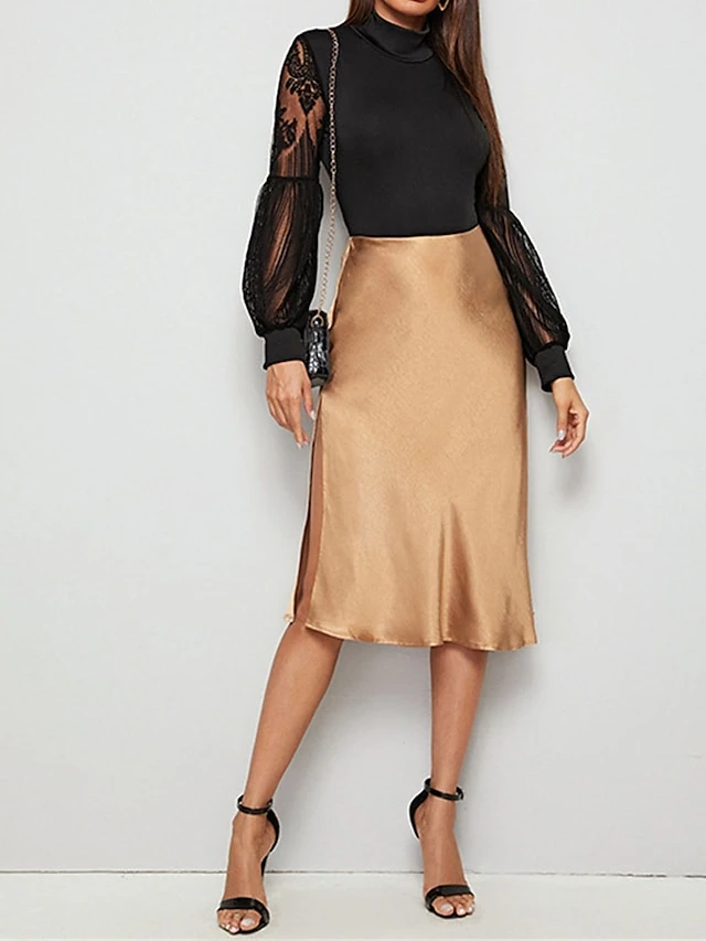 Women’s Bodysuit Lace High Waist Solid Color Stand Collar Streetwear Work Street Regular Fit Long Sleeve Lantern Sleeve Black S M L Fall