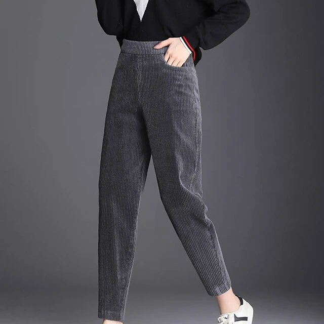 Women‘s Fleece Corduroy Pants Chinos Trousers Ankle-Length Side Pockets Micro-elastic Mid Waist Fashion Casual Weekend Black Brown S M