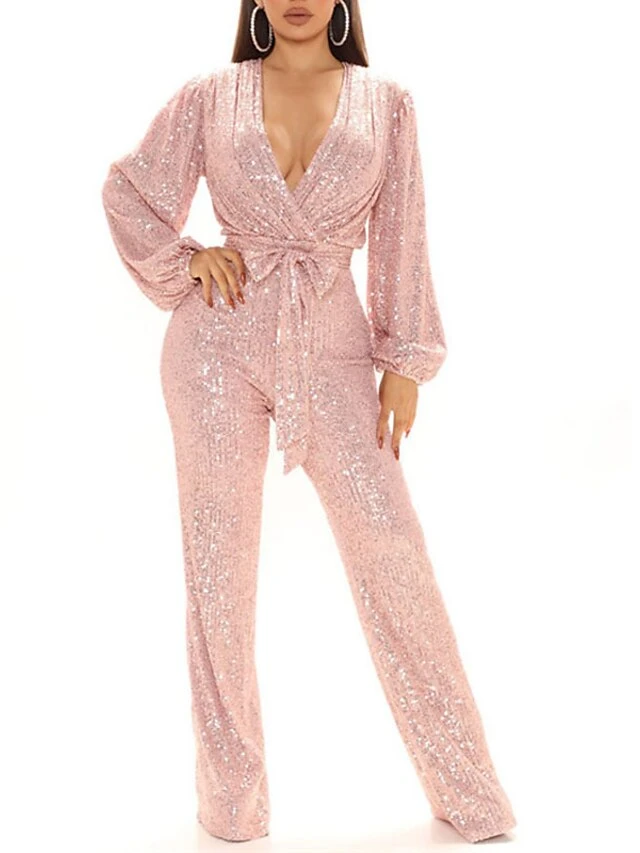 Women‘s Jumpsuit Deep V Wedding Sparkly Sequin Streetwear Fall Winter Regular Fit Long Sleeve Pink White Black S M L Fall Cold Weather