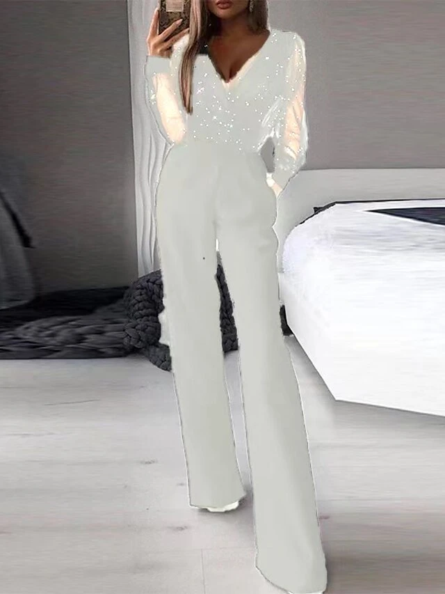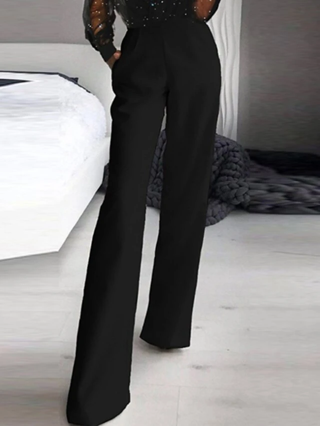 Women‘s Jumpsuit For Special Occasions Mesh Sequin Solid Color V Neck Elegant Party Prom Regular Fit Long Sleeve Black S M L SpringFall