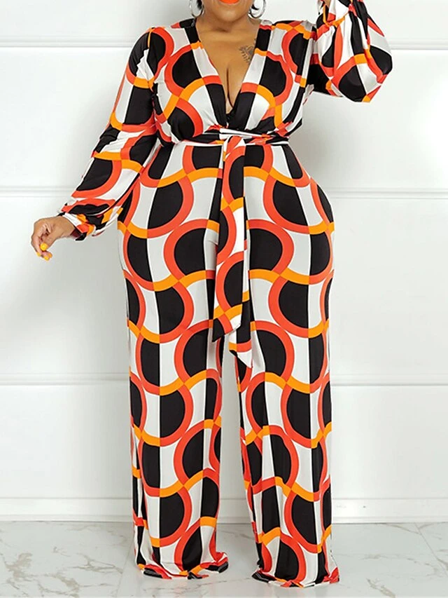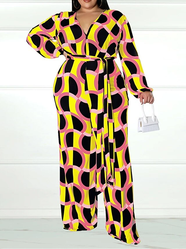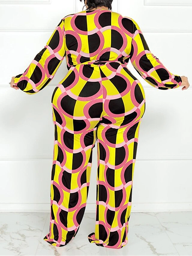 Women’s Jumpsuit High Waist Print Geometric V Neck Casual Street Daily Regular Fit Long Sleeve Black Yellow Wine XL XXL 3XL Spring
