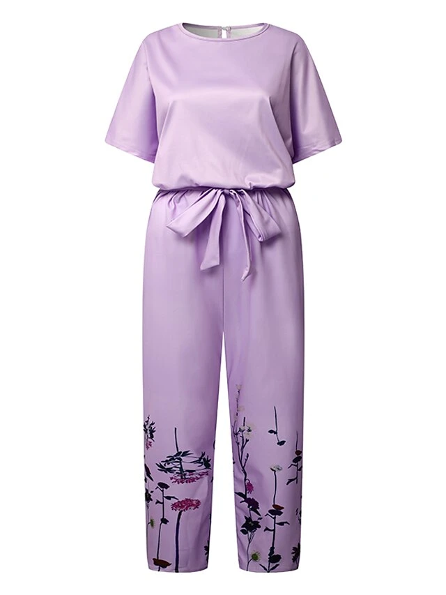 Women’s Jumpsuit Lace Up Print Floral Crew Neck Elegant Party Prom Straight Regular Fit Half Sleeve Purple S M L Spring