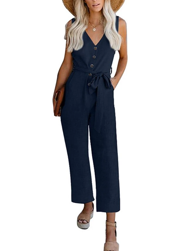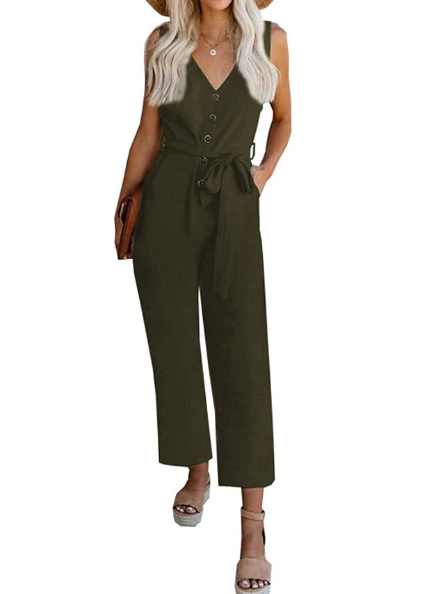 Women’s Jumpsuit Patchwork Solid Color V Neck Casual Daily Holiday Straight Regular Fit Sleeveless Blue Army Green Beige S M L Summer / Plus Size