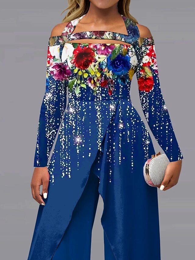 Women’s Jumpsuit Print Floral Off Shoulder Elegant Wedding Party Wide Leg Regular Fit Long Sleeve Blue S M L All Seasons