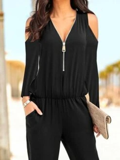 Women’s Jumpsuit Zipper Stand Collar Ordinary Sport Regular Fit Long Sleeve White Black S M L Spring