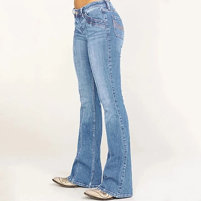 Women‘s Low Rise Jeans Flared Pants Bell Bottom Full Length Denim Side Pockets Wide Leg Micro-elastic Fashion Street Casual Blue Deep Blue S M