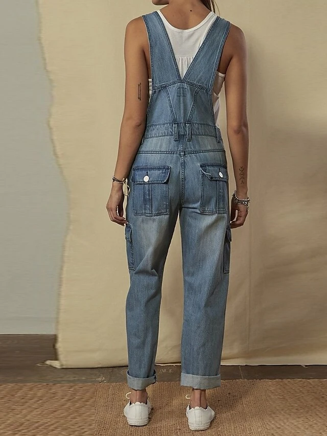 Women‘s Overall Cowgirl Denim Backless Button Solid Color Square Neck Streetwear Daily Vacation Regular Fit Sleeveless Blue S M L Summer