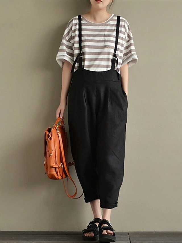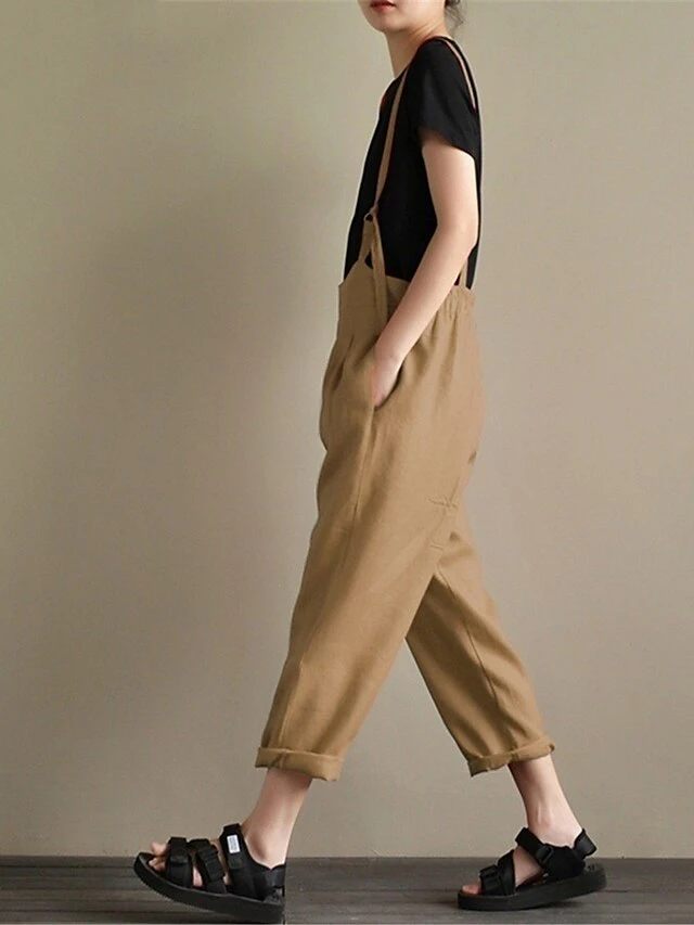 Women’s Overall Pocket Solid Color U Neck Basic Daily Vacation Regular Fit Sleeveless Black Wine Khaki S M L Summer