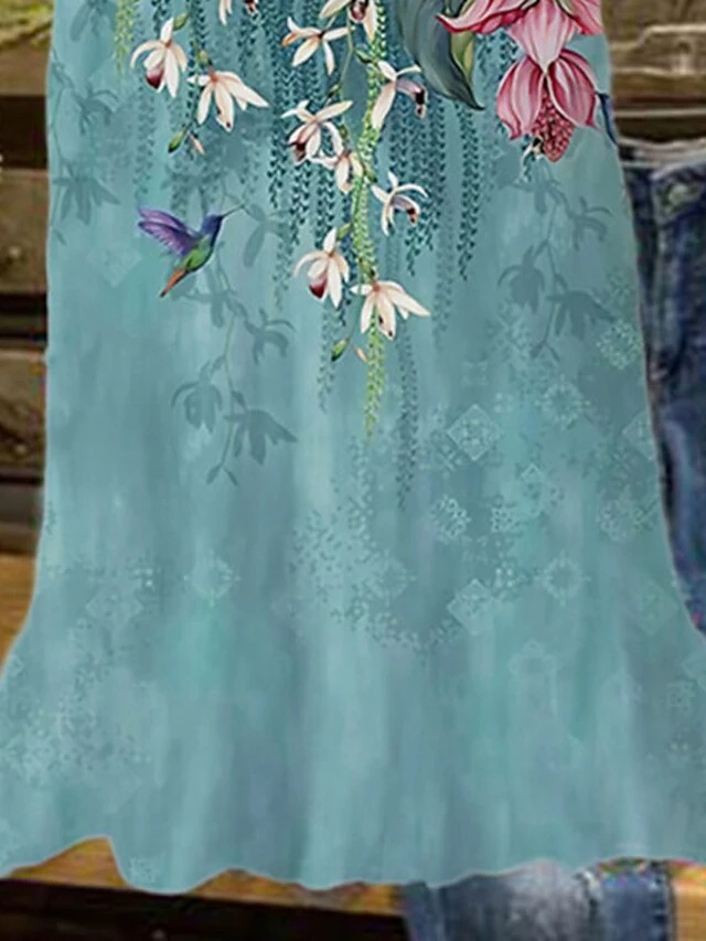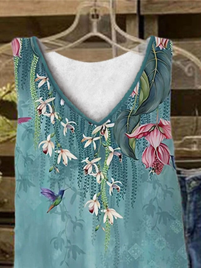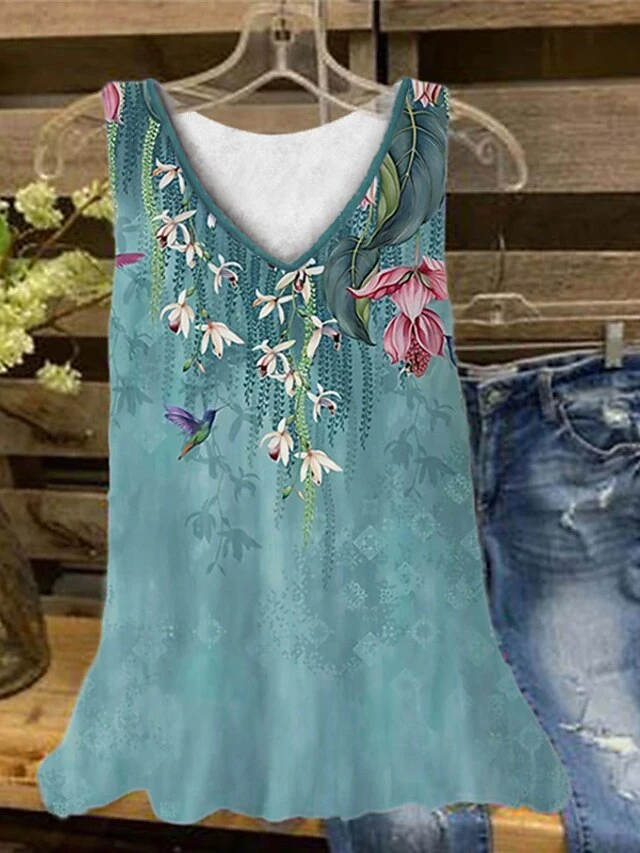 Women’s Plus Size Tank Top Blue Floral Print Sleeveless Daily Holiday Going Out Streetwear V Neck Regular Fit Summer Spring