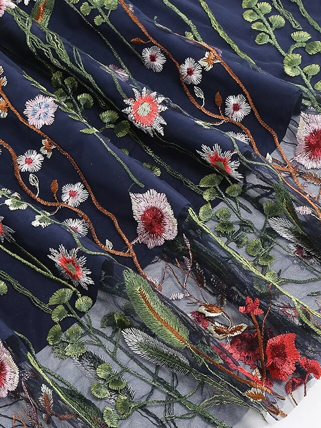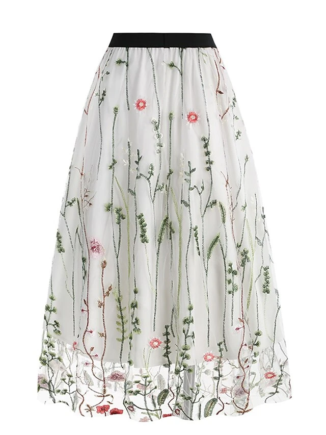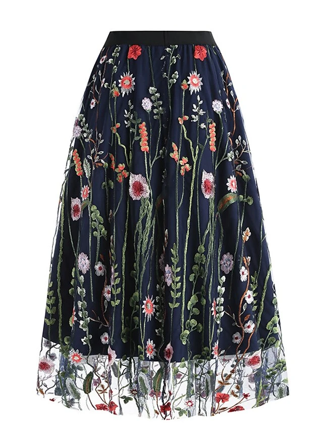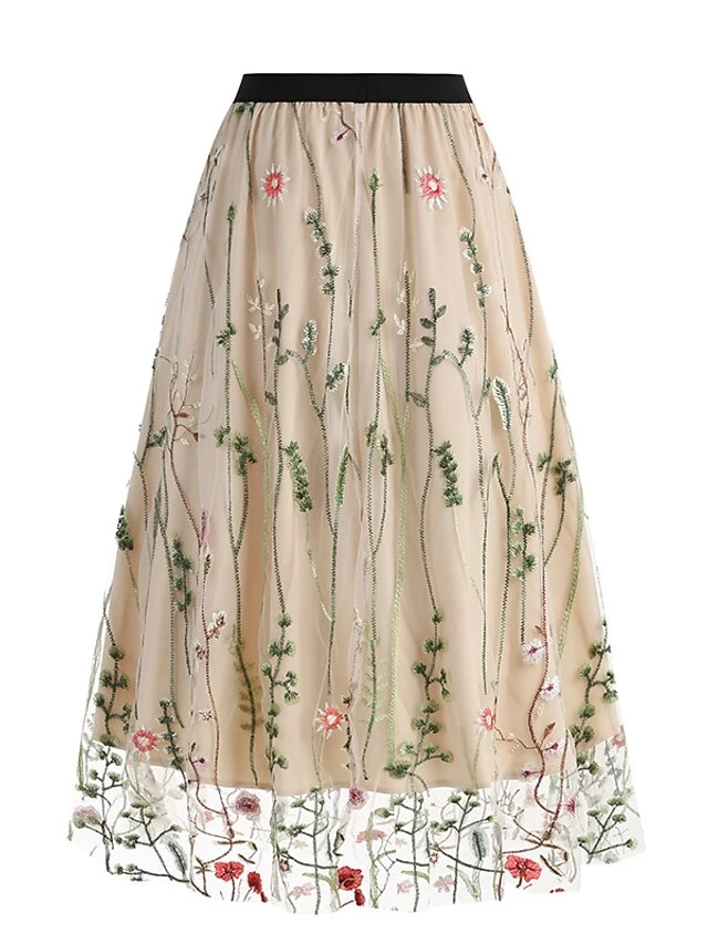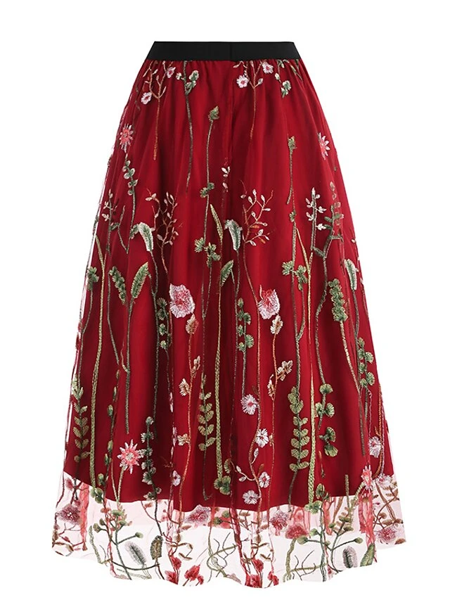 Women’s Skirt Swing Midi Tulle Apricot Black White Red Skirts Fall & Winter Floral Embroidered High Waist Vintage Elegant Christmas Xmas Street M L XL