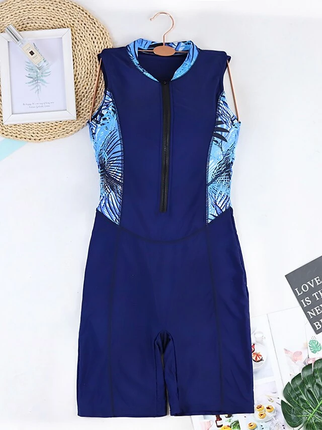 Women’s Swimwear Rash Guard Diving Normal Swimsuit Patchwork Printing Plant Blue Padded High Neck Bathing Suits New Vacation Holiday