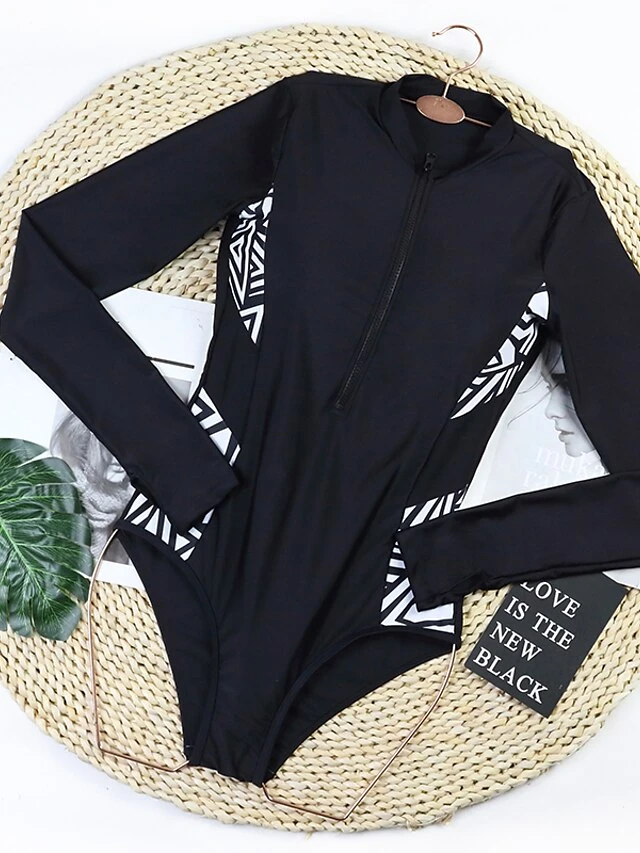 Women’s Swimwear Rash Guard Diving Normal Swimsuit Zipper Splice Multicolor Black Padded High Neck Bathing Suits New Vacation Holiday