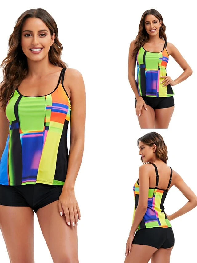 Women’s Swimwear Tankini 2 Piece Normal Swimsuit Mixed Color Printing Adjustable String Color Block Multi Color Light Green Padded Strap Bathing Suits Sports Vacation Geometric