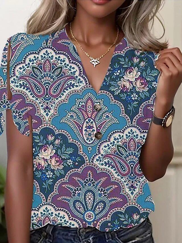 Women’s T Shirt Tee Blouse Red Blue Green Graphic Button Cut Out Print Short Sleeve Casual Basic V Neck Regular Fit