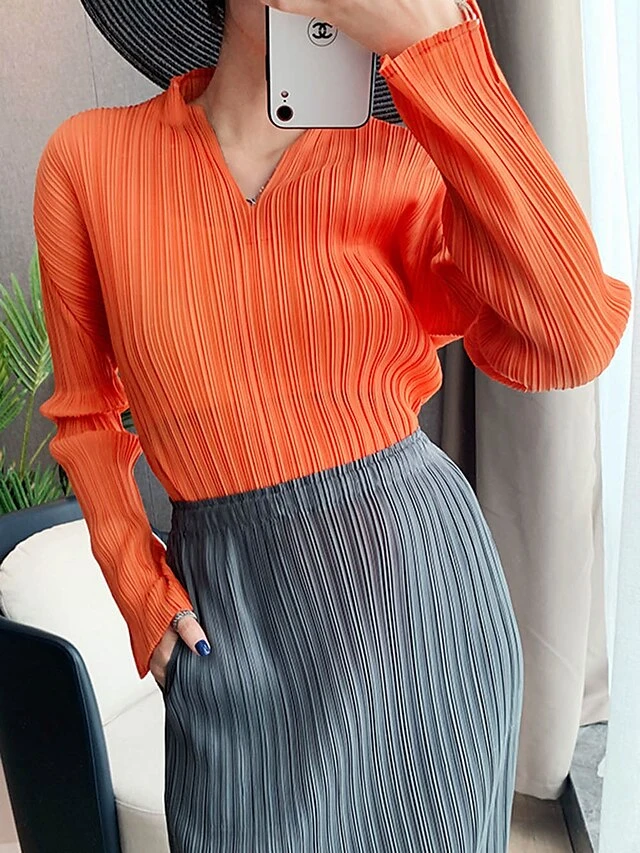 Women’s T Shirt Tee Textured Orange Brown Plain Long Sleeve Daily Weekend Basic Neon & Bright V Neck Regular Fit Spring &Fall
