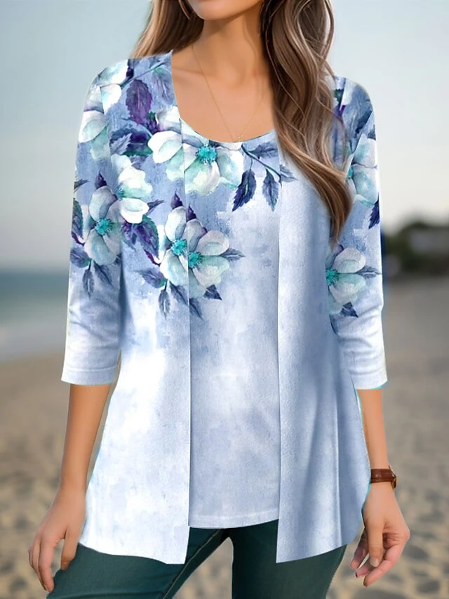 Women’s T Shirt Tee Yellow Pink Blue Floral Print Long Sleeve Daily Weekend Basic Round Neck Regular Fit Floral Painting Spring &Fall