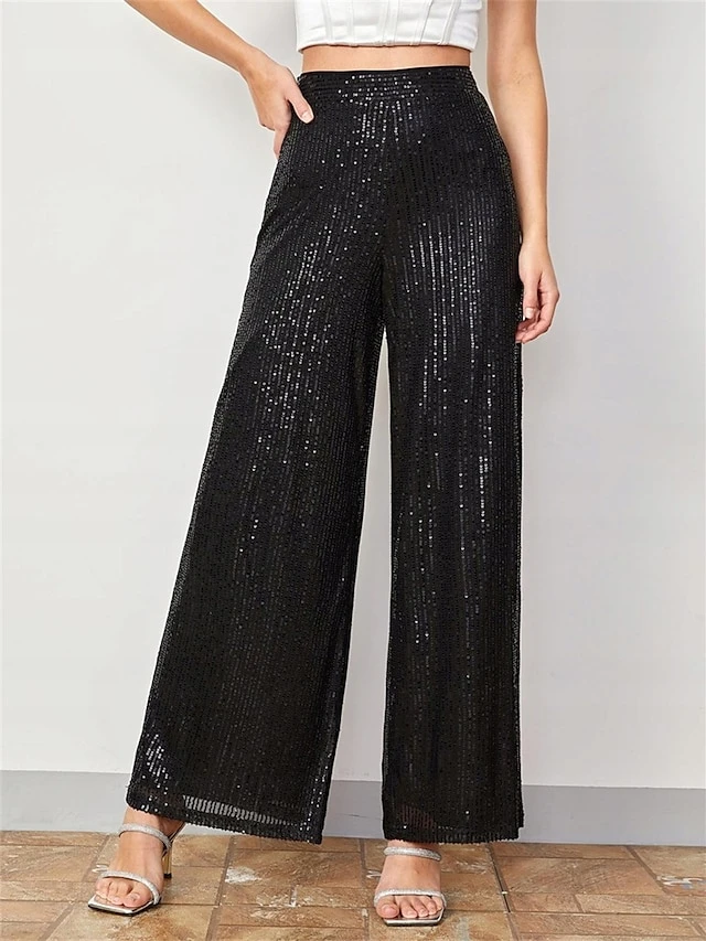 Women’s Wide Leg Pants Sequin Trousers Black Mid Waist Fashion Streetwear Party Street Daily Micro-elastic Full Length Breathability Plain S M L XL